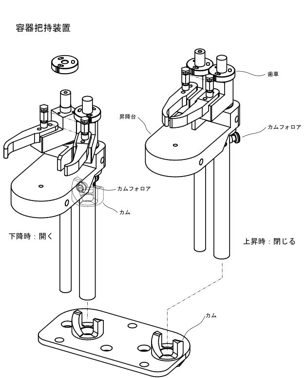 この図は特許出願時に提出した物ですが、当初は2D図面だったために、弁理士の先生から「解りづらい」とのご指摘を受けて3Dで描き直しました、これはボトルの載置台で爪が開閉してボトルを把持する機構です、アイソメ図にすると簡単な機構だと解りますが、二次元図面だと線がゴチャゴチャになっていました